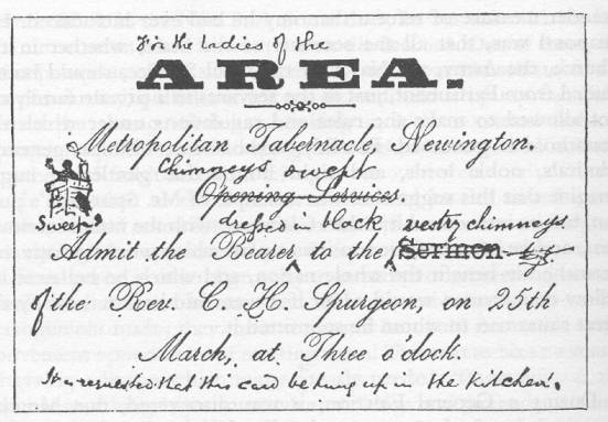 When the Tabernacle was about to be opened, tickets of admission to the various gatherings were printed. The one intended as a pass to the first service seemed to Mr. Spurgeon so unsuitable to the occasion that he turned it into a sweep's advertisement by annotating the front of it in this humorous style: