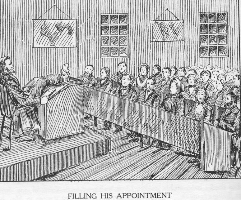 An incident or two showing his devotion and energy will close this sketch. At one time, one of his ankles was covered with boils and he could not bear his foot to the floor, such was the pain. He had an appointment 26 miles distant and the only way for him to go was on horseback. He took an old, gentle horse, slow and sure footed, mounted him, got his sore foot on the horn of the saddle and in this way rode to his church; had to be helped off his horse and into the house; and sat with his foot on the desk before him and preached to his congregation! And this against the protest of his family, and to a church paying him less than $100 a year for once a month preaching.
