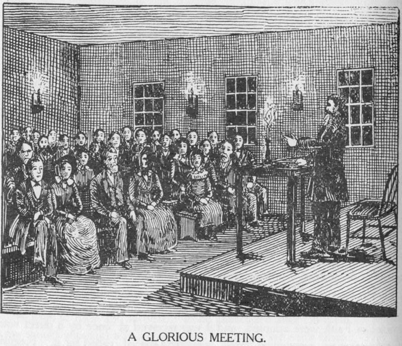 The early Baptists were an enthusiastic, emotional people. Whatever was in their hearts broke forth spontaneously. There was little suppression of the emotional nature. Shouting and noisy demonstrations were not uncommon. If one "got happy," all would likewise "get happy" for the enthusiasm was contagious. Few of the preachers would suppress it, though some were not hearty in their approval. But even these thought it the wisest plan to let it take its course. An instance of this outburst occurred as late as 1885. The subject of Foreign missions was under discussion at one of the Associations, and one of the speakers said that it cost other denominations $200 for each convert among the heathen, whilst it cost the Baptists only $37. One of the brethren sprang to his feet, exclaiming--"Think of that, brethren! Just think of that! Baptists can make angels for glory at $37 a head!" The effect can be imagined.