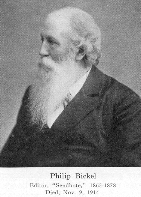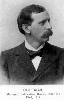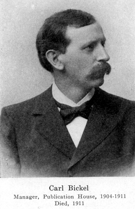 In 1878, Brother Bickel made the momentous decision, at the earnest solicitation of many American friends and after much prayer, to return to Germany and there build up the publishing interests of the German Baptists, and Julius C. Haselhuhn [Jugendfreund, October, 1922.] took his place and served very acceptably until his death in 1893, when he was succeeded by Julius C. Crimmel1 who in turn gave way to the present editor, Gottlob Fetzer, in 1901. The business end of the Society's activities, after Schulte's retirement in 1892, was taken care of by Peter Ritter who in turn was succeeded by Carl Bickel in 1904, after whose death in 1911, the present incumbent, Henry P. Donner, took charge of the business interests.