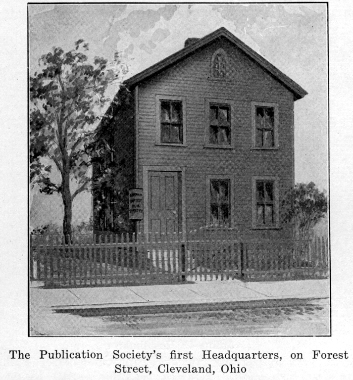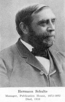 The Publication Society was the first of the three larger branches of our General Societies to effect a legal incorporation, obtaining its charter in 1870. After the headquarters had been removed to Cleveland, O., in 1871, the Society came into possession of a small printery on Forest Street where a book department was added and P. W. Bickel, who up to this time had been editor and business manager with the rather high sounding title of "Secretary," was given an assistant in the person of Herman Schulte who took charge of the business end of the corporation in 1872. Brother Schulte was a most patient, painstaking and conscientious man and served the denomination for twenty consecutive years in a period when the advance was greatest.